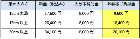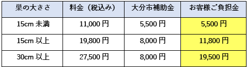 補助金額は、スズメバチの巣の駆除費用の2分の1の額(該当額に100円未満の端数があるときは、これを切り捨てた額)になります。
